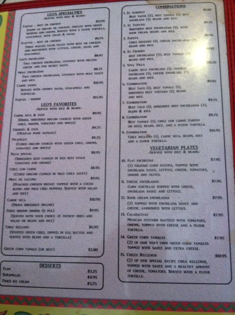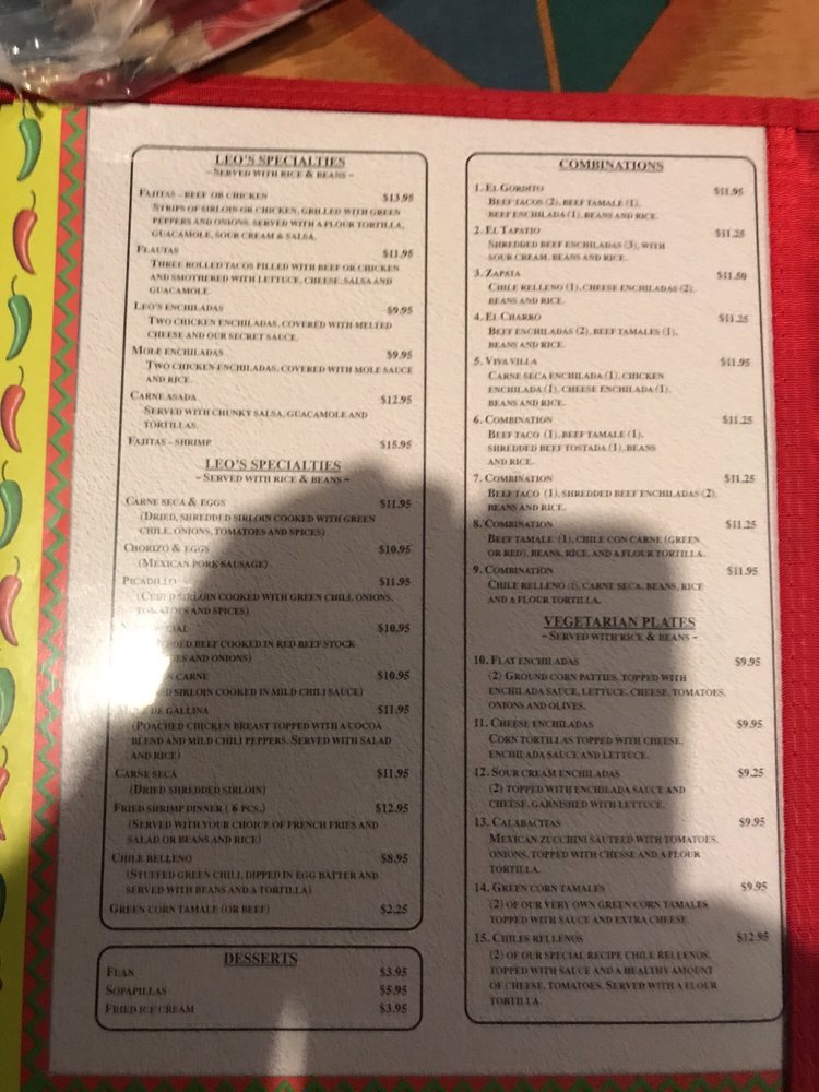 Leo's is a Mexican restaurant located in Tucson, AZ, offering a variety of dishes with many vegetarian options. Specializing in dishes like Fajitas Especialidade, Leo's enchiladas, mole enchiladas, Carne Asada, and shrimp fajita, Leo's menu showcases delicious Mexican cuisine. The establishment also offers a range of favorites like Carne Seca and Eggs, Chorizo and Eggs, Picadillo, and more. Combining plates with different combinations like El Gordito Combo, El Tapatio Combo, and Zapata Combo provide a taste of multiple flavors in one sitting. Customers rave about the authentic food, friendly service, and welcoming atmosphere, making Leo's a must-visit spot for Mexican food enthusiasts. With positive reviews highlighting the delicious taste and generous portions, Leo's stands out as a hidden gem for Mexican cuisine lovers in Tucson.